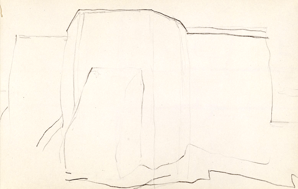 Georgia O’Keeffe, Untitled (Ranchos Church) Schneider Sketchbook, 1929-1930, Graphite on paper, 5 x 7 7/8 in