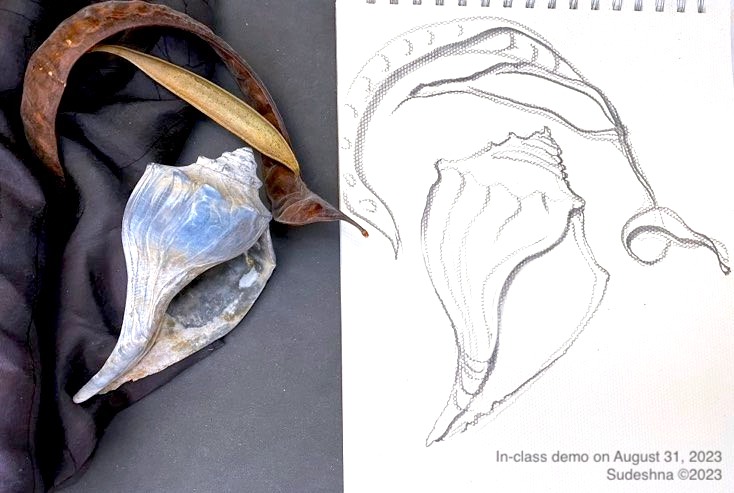 - Gesture Drawing: Even though we are not focusing on gesture drawing that much at this point, these videos can help us understand the beauty of the expressive qualities of lines in gesture drawing, which we will explore further later in the semester when we explore capturing the volume and tonality of 3D forms before moving onto shading. Here’s a recording from one of my live class-demos from another semester, showing how we build the volume of an object by starting with gestural lines and then combine mass-gesture drawing and cross-contour drawing to further build the form–shared here to make you see the use of gesture drawing further down the road: