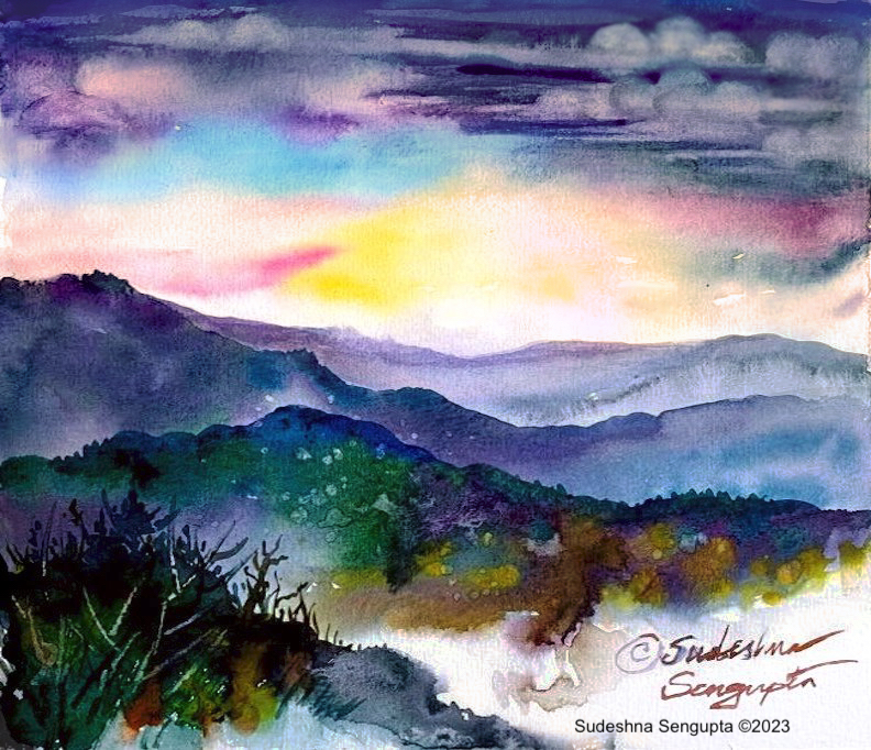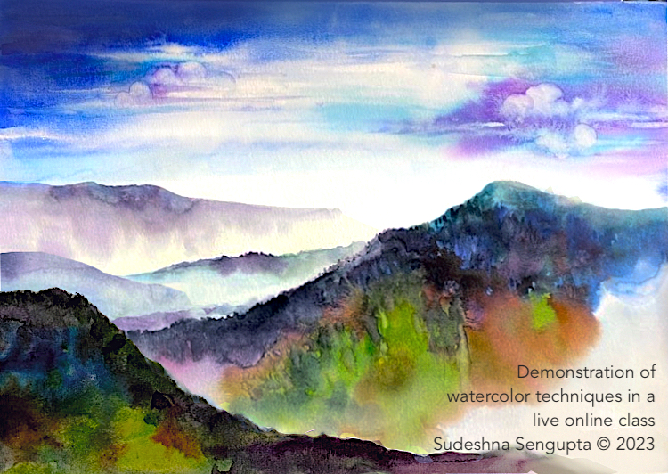 Through a focused exercise of layering watercolor washes, we can explore the concept of atmospheric perspective achieved through graduated layering to paint a landscape.