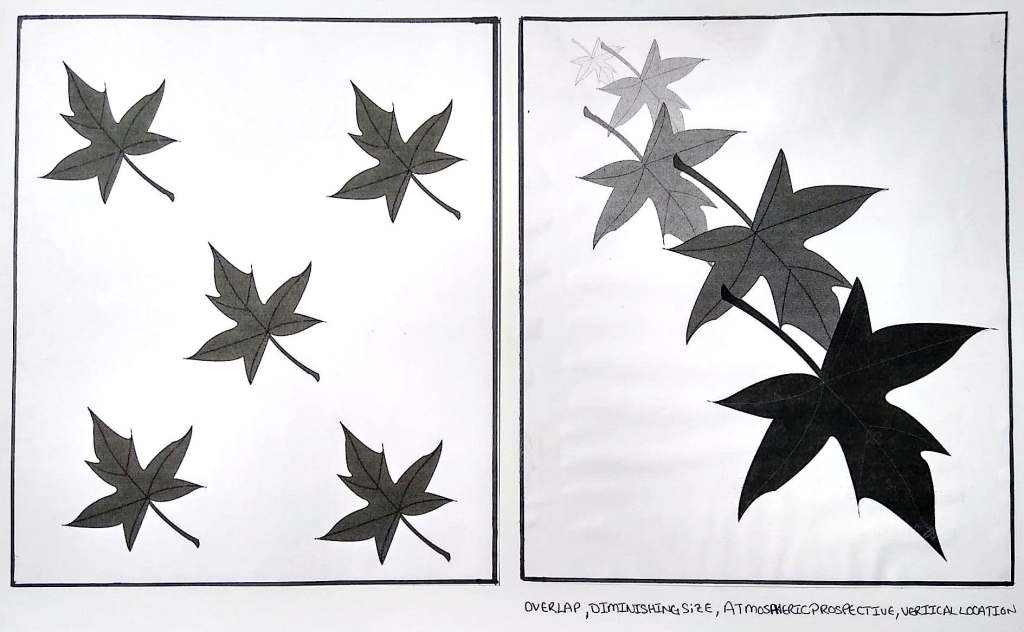 The two images below placed side by side show how repeating a motif without changing anything makes the image look flat (left) but repeating (right) the same motif by following the principle of gradation or incremental changes in various elements creates a sense of depth, resulting in a composition with atmospheric perspective.