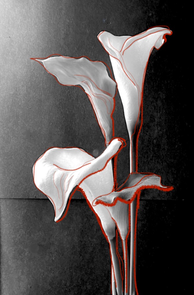 Notice in the image in the middle that by thinking just in terms of value-contrast, we can appreciate more the phenomenon of ‘lost and found edges’ caused by the way the light shines on the forms. Try capturing that dramatic change in the contour-definition by varying your line weight/pressure and by the rotating movement of the pencil.