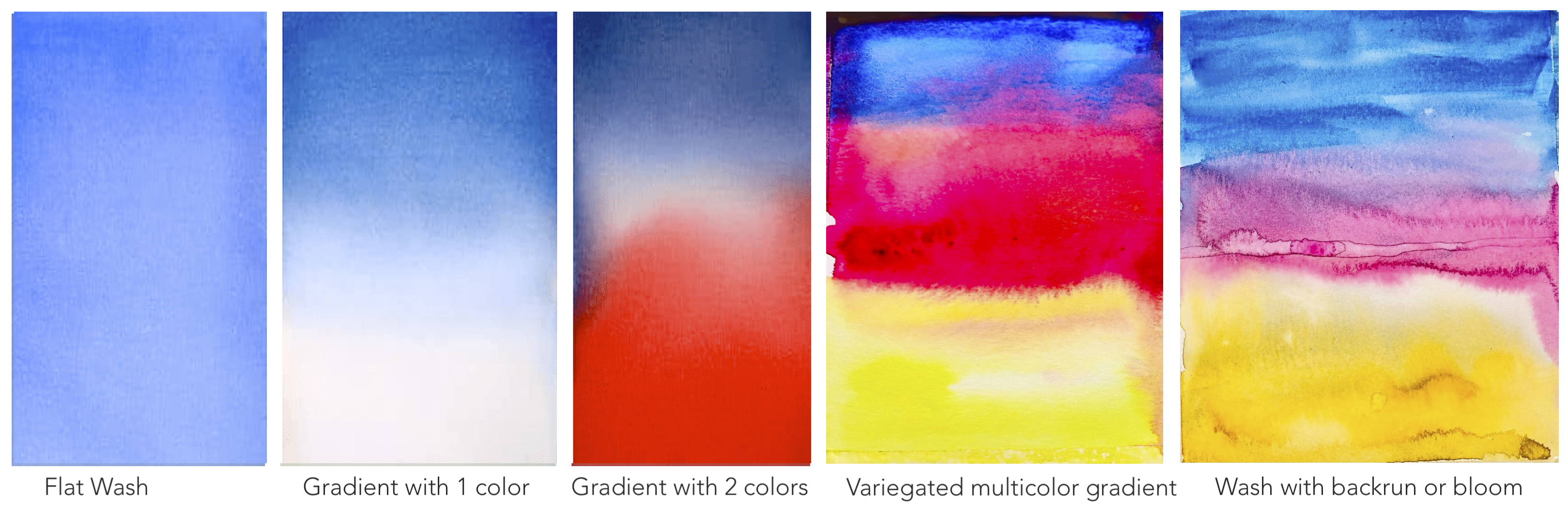 - Gradient or graded or graduated wash with two colors – great for skies, soft transitions of light to dark or vice versa, used often in Far-Eastern Asian watercolor and woodcut prints.